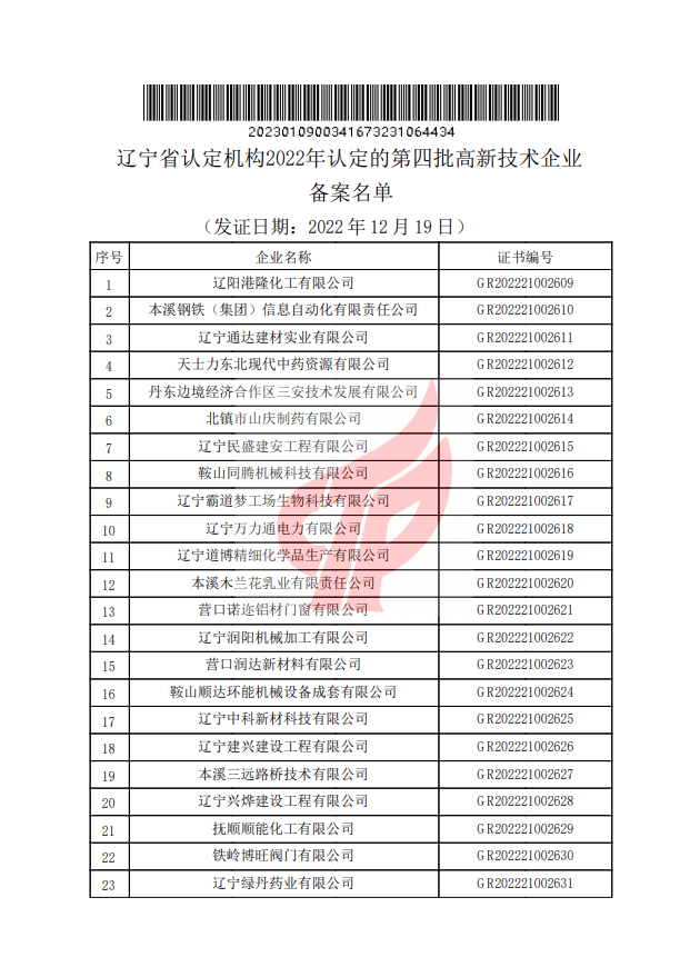 根据《高新技术企业认定管理办法》(国科发火〔2016〕32号)和《爱体育(中国)官方网站-登录入口》(国科发火〔2016〕195号)有关规定,现对辽宁省认定机构2022年认定的第四批34家高新技术企业备案名单(详见附件)予以公告。